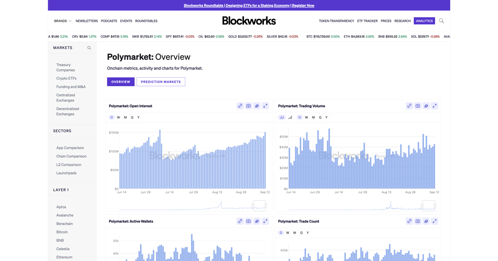 Blockworks 提供了顶级的 Polymarket 分析仪表板,旨在为研究人员、投资者和高级用户提供深度的市场洞察。该平台以严谨的链上数据和透明的方法论为基础,集成了实时未平仓合约、活跃钱包、交易量及市场细分等关键指标。
