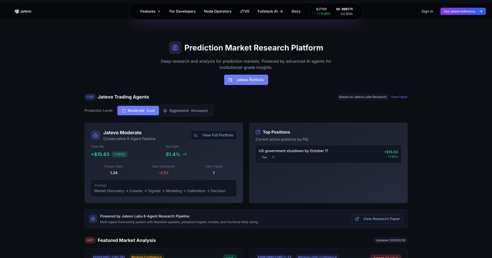 Q1: 什么是 Jatevo? A: Jatevo 是一个基于 6 智能体 AI 流水线的深度研究平台,专门为 Polymarket、Kalshi 等预测市场提供机构级的数据分析服务。