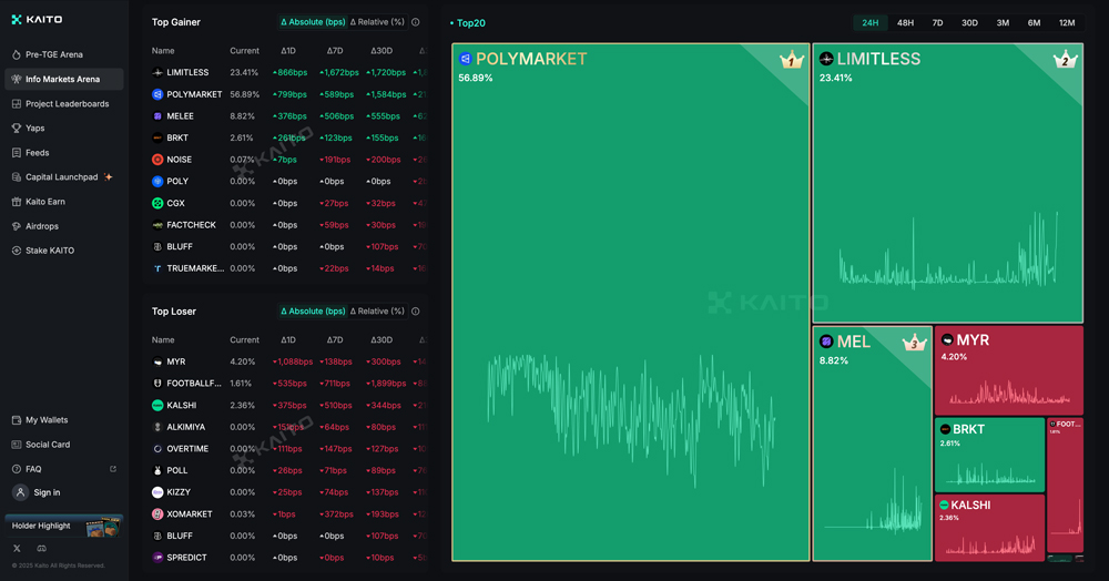 Kaito 致力于为 Web3 用户提供深度市场情报。它推出了“信息市场竞技场(Information Market Arena)”,用于量化和展示不同预测市场平台的社区关注度。