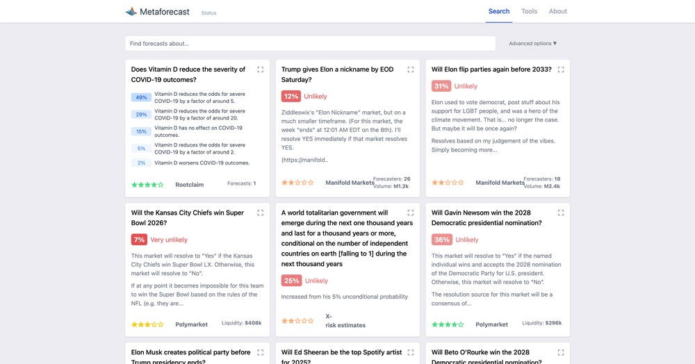 Q2: 如何使用 Metaforecast? A: 只需在搜索框中输入感兴趣的主题或问题,系统将即时返回相关的概率预测、原始平台链接以及专家评级。