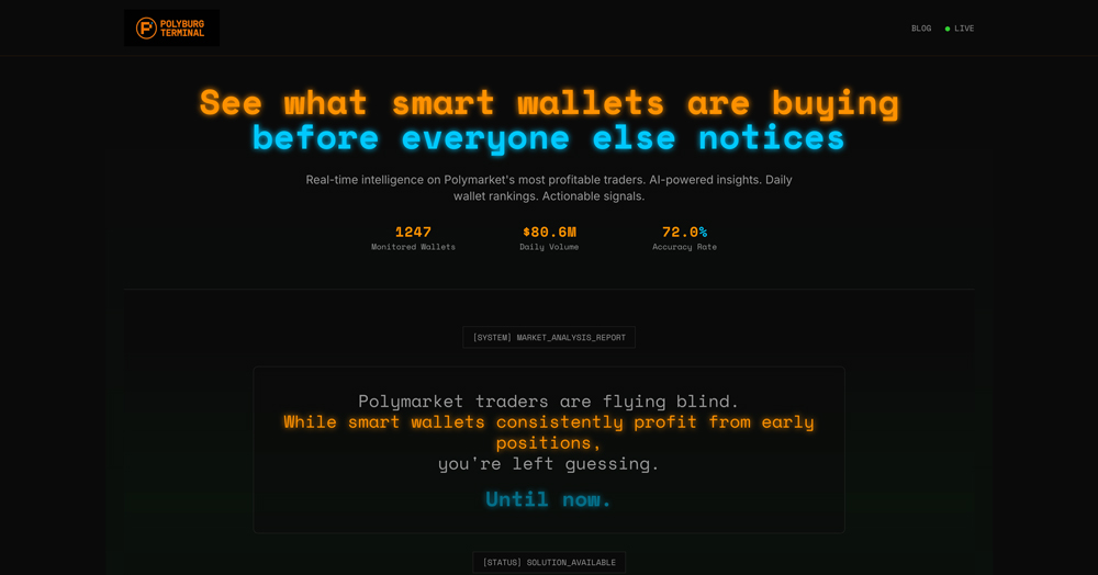 Q1: 什么是 Polyburg Terminal? A: 这是一个实时智能平台,追踪超过 1,200 个盈利的 Polymarket 钱包。当智能资金进行交易时,它会提供 AI 驱动的洞察和即时提醒。