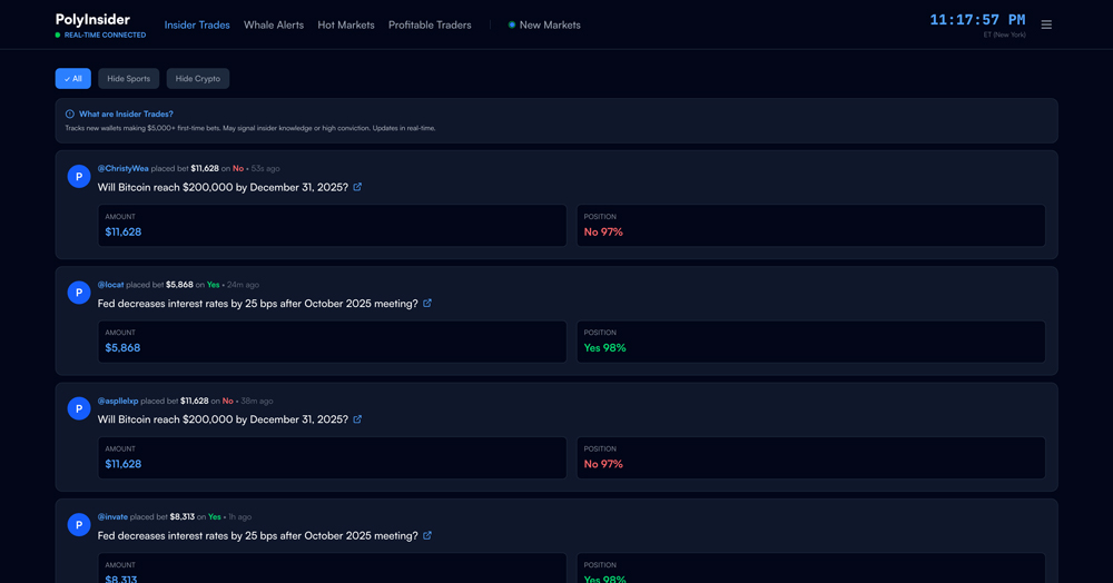 Q: PolyInsider 如何检测潜在的内幕交易? A: 系统追踪新钱包进行的 $5,000 以上首次投注。这通常预示着为了基于非公开信息交易而刻意规避被发现的新账户活动。
