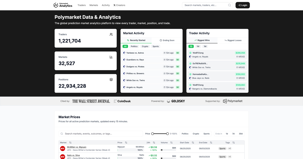 Polymarket Analytics 致力于为 Polymarket、Kalshi 等预测市场提供深度洞察。该平台专为高级交易者、研究人员和分析师设计,通过强大的数据工具套件,帮助用户发现顶级交易者、追踪投资组合、分析市场活动以及监控资金动向。