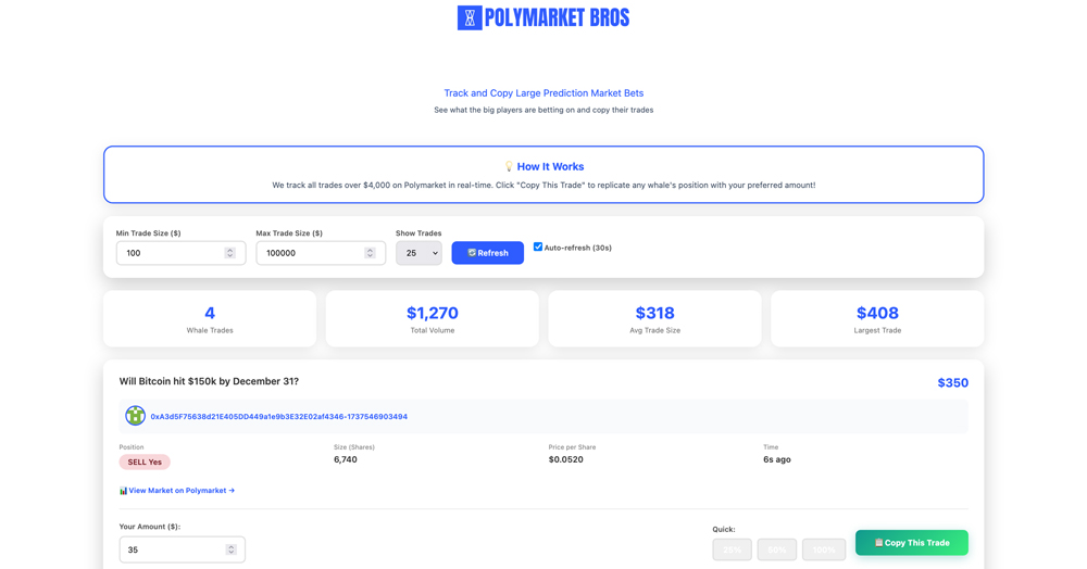 实时监控 Polymarket 上超过 $4,000 的大额交易,提供一键跟单指引、交易者身份识别及自动刷新功能,永久免费。