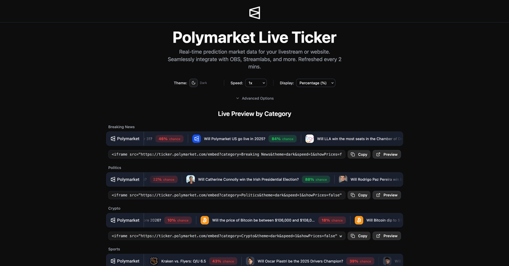 Polymarket Live Ticker 是 Polymarket 开发的官方小部件工具,旨在帮助内容创作者、主播和网站所有者将实时预测市场数据轻松嵌入到其内容中。