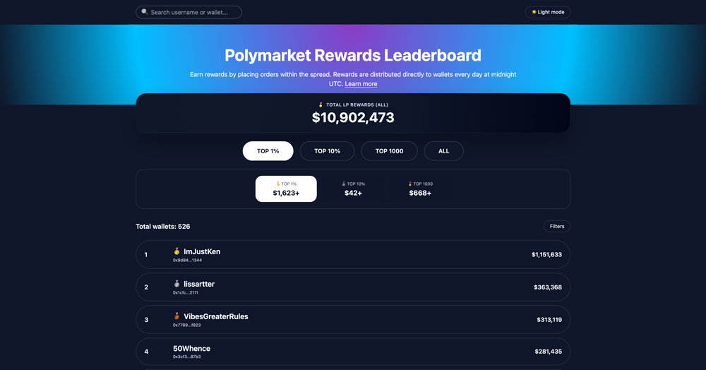 Q1: 什么是 PolyRewards?它是如何运作的? PolyRewards 是一个独立的追踪平台,专门针对 Polymarket 的官方流动性奖励计划。它为已获得奖励的用户提供排行榜统计、表现分析及数据可视化服务。