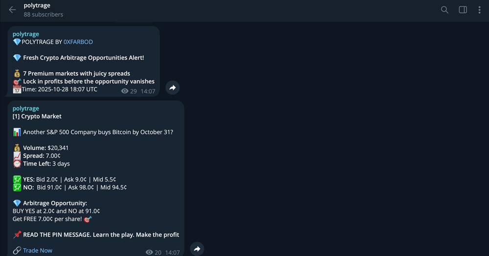 Polytrage 每 15 分钟发送一次实时提醒,定期更新具有充足交易量和有利定价条件的新兴价差机会。