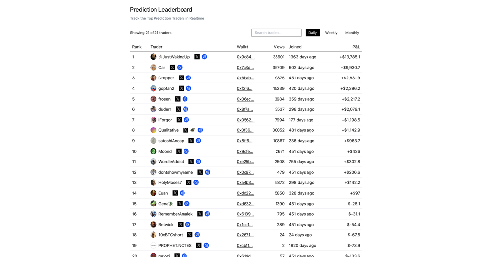 这是一个实时排行榜平台,专门追踪顶级预测市场交易者的绩效,显示其盈亏、钱包地址以及在多个时间框架下的排名。