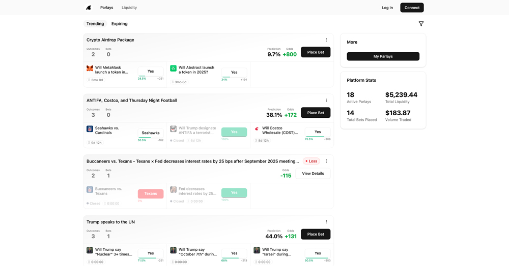 一句话简介:基于 Polygon 构建的去中心化预测市场综合投注(Parlay)平台,允许用户组合多个 Polymarket 事件以实现指数级收益。